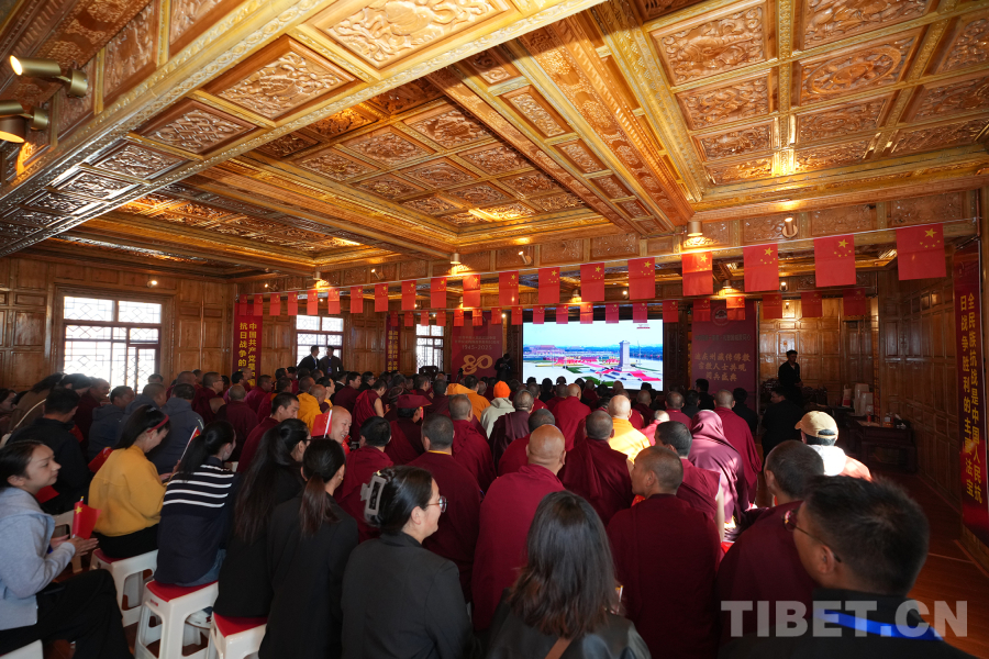 中國(guó)西藏網(wǎng)訊 9月3日上午,紀(jì)念中國(guó)人民抗日戰(zhàn)爭(zhēng)暨世界反法西斯戰(zhàn)爭(zhēng)勝利80周年大會(huì)在北京天安門(mén)廣場(chǎng)隆重舉行,以盛大閱兵儀式,同世界人民一道紀(jì)念這個(gè)偉大的日子,共同開(kāi)創(chuàng)更加光明的未來(lái)。同一時(shí)刻,在云南省迪慶藏族自治州香格里拉市松贊林寺,130余名藏傳佛教界人士觀看大會(huì)直播,共同見(jiàn)證這一歷史性時(shí)刻,感受新時(shí)代中國(guó)國(guó)防力量,激蕩愛(ài)國(guó)愛(ài)教情懷。