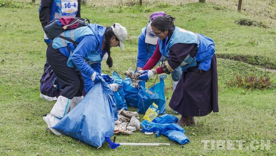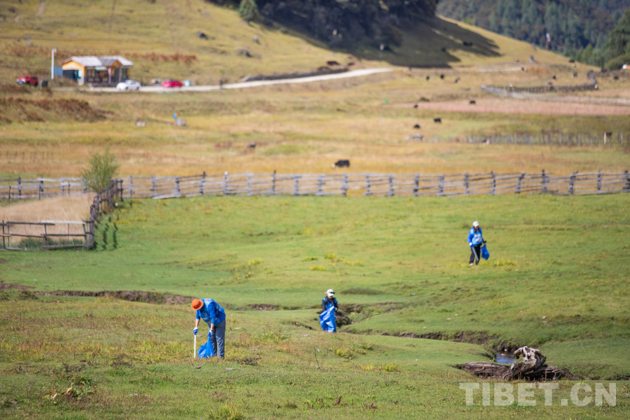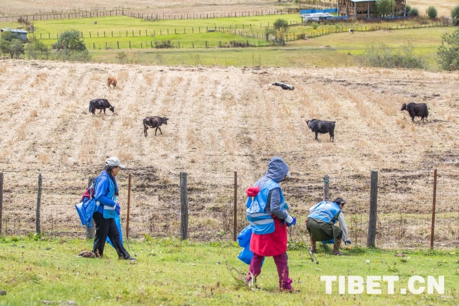 圖為志愿者們在魯朗小鎮(zhèn)周邊撿拾垃圾