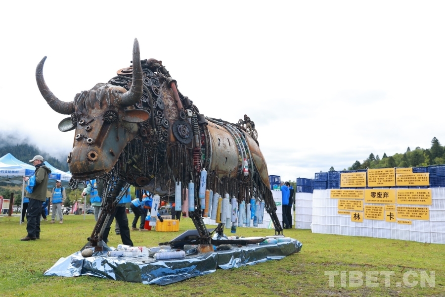 圖為用收集的廢棄塑料瓶創(chuàng)造的一座牦牛造型環(huán)保藝術(shù)裝置