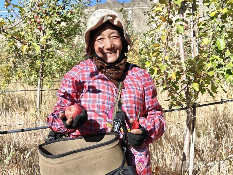 圖為山南市貢嘎縣吉雄鎮(zhèn)劉瓊村的村民次尼在貢嘎縣矮化蘋果種植項(xiàng)目基地,向記者鏡頭展示其在家門口就業(yè)的喜悅之情