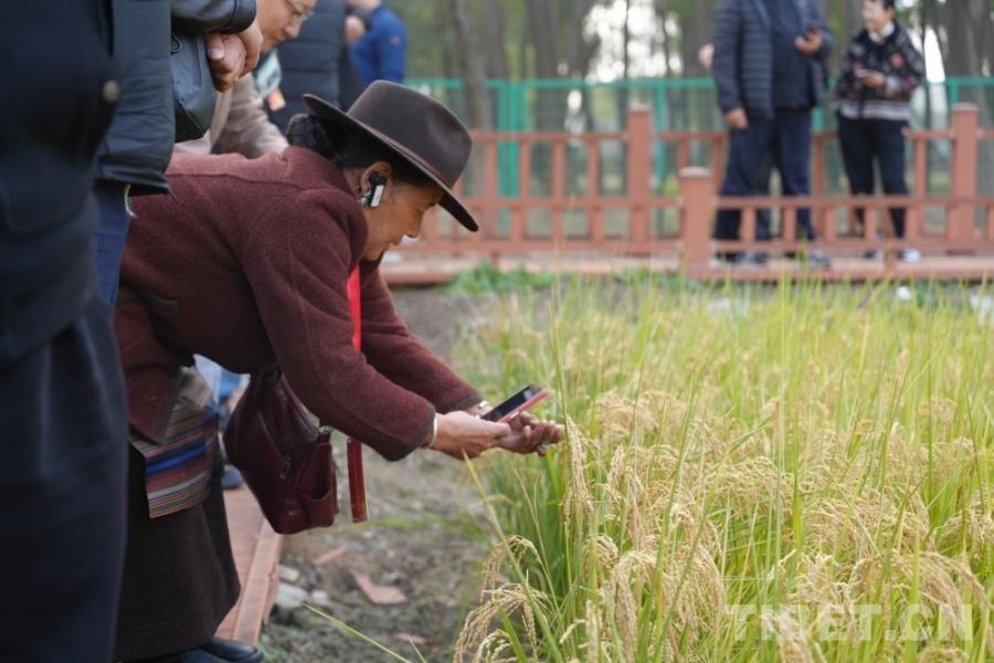 圖為西藏基層干部學(xué)習(xí)參觀團成員對豐收的稻谷愛不釋手,連連拍攝 攝影:王茜