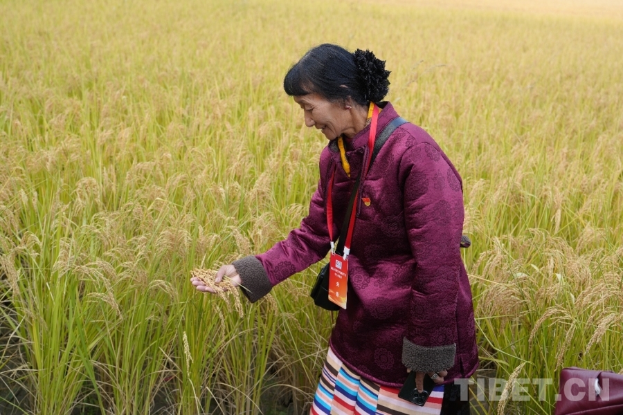 圖為西藏基層干部學(xué)習(xí)參觀團成員央青反復(fù)摩挲著沉甸甸的稻谷 攝影:王茜