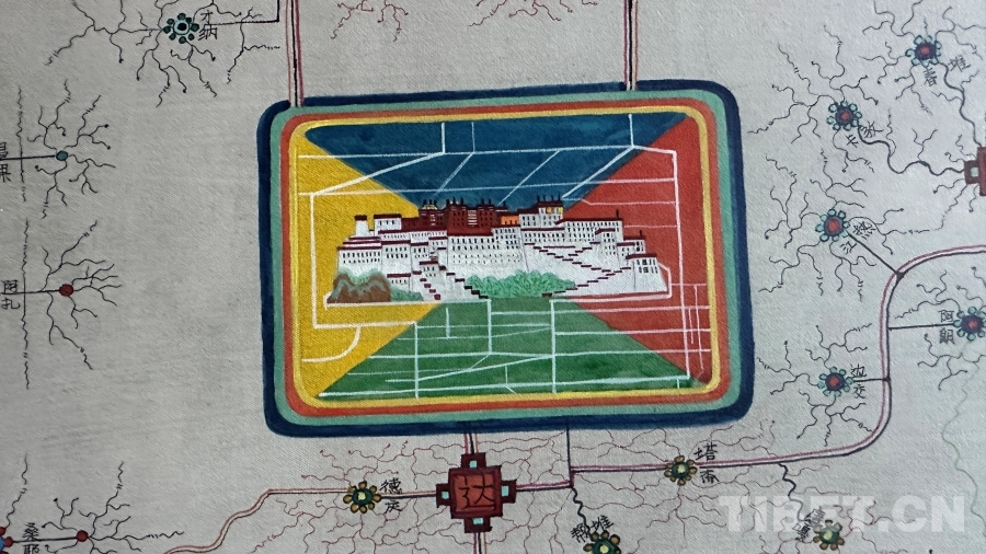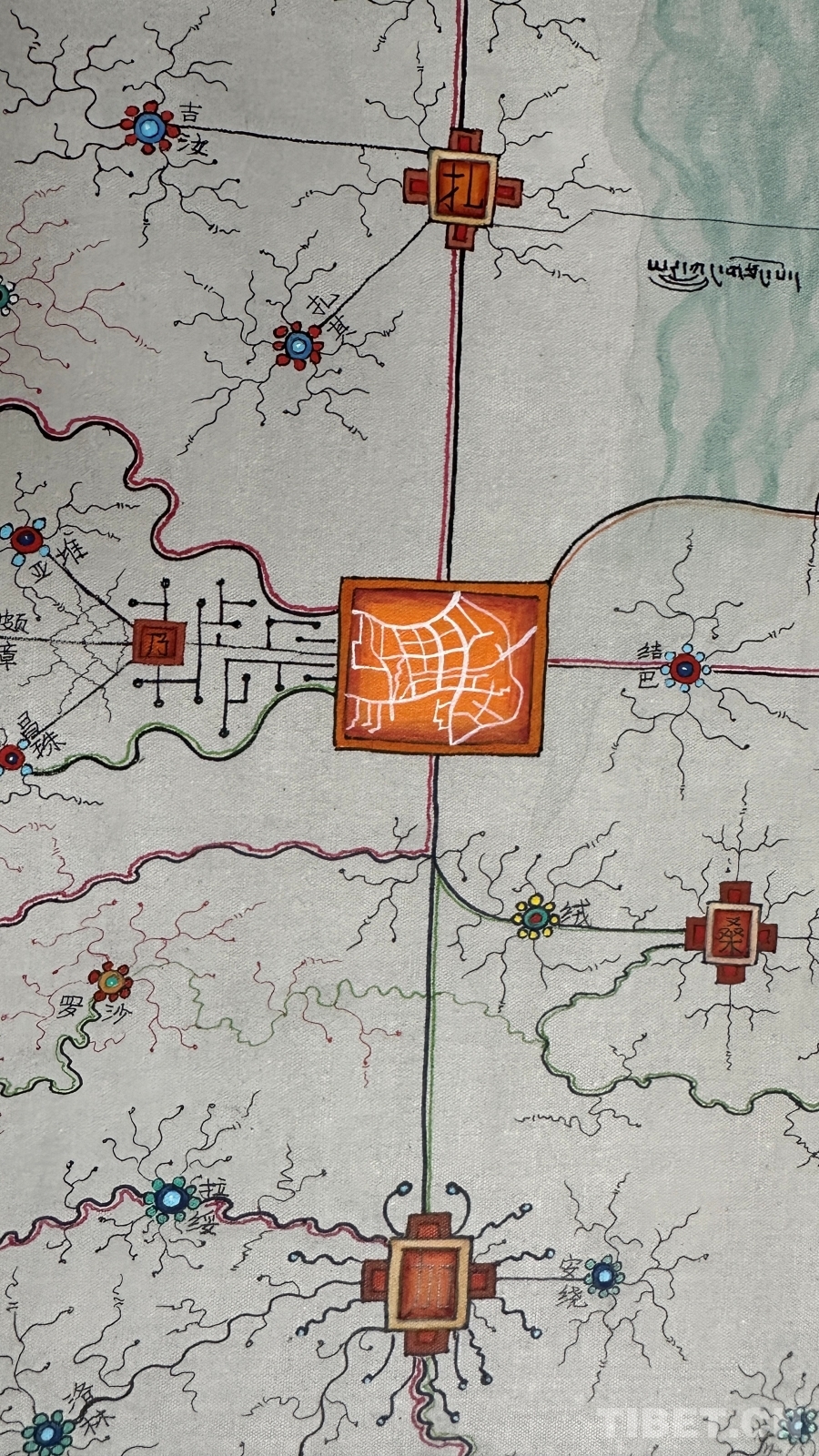 達布詳細(xì)解釋了這幅唐卡的圖像系統(tǒng):正方形代表市、區(qū),內(nèi)部畫有該市區(qū)主干道地圖;十字方形代表縣;圓形寶石形代表鄉(xiāng)鎮(zhèn);藏文“嗡”字代表名勝古跡;此唐卡以黑線為所有公路基礎(chǔ)線,黑線邊上的紅黃線代表國道和高速,綠線代表省道,黑細(xì)線代表縣鄉(xiāng)鎮(zhèn)及村級公路。沿途還繪制了珠峰、古格王國遺址、納木錯等代表性景點,并用藏文標(biāo)注名稱。