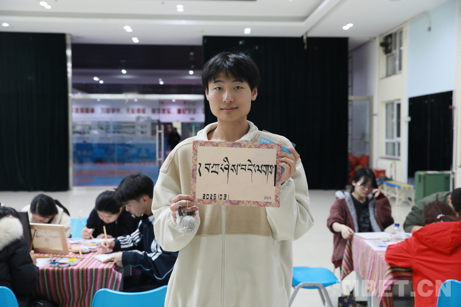 圖為2024級公共管理專業(yè)的楊乘鶴同學展示他在藏文書法體驗環(huán)節(jié)創(chuàng)作的作品。攝影:畢然