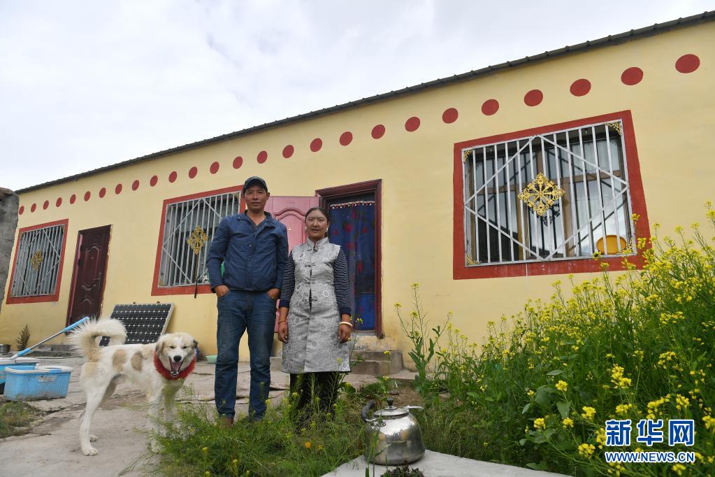 在青海省玉樹(shù)藏族自治州治多縣治渠鄉(xiāng)同卡村,村民昂文西讓和妻子布沙措江卓瑪站在易地搬遷的新家院子里合影(2019年9月12日攝)。新華社記者 孫瑞博 攝