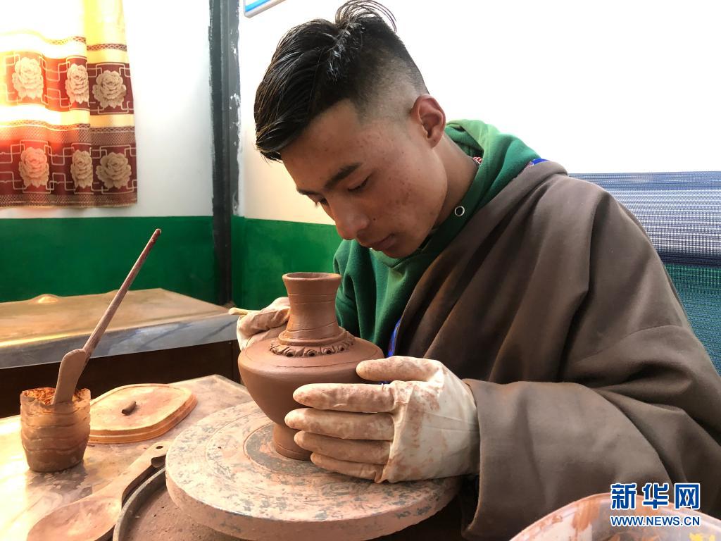 青海省玉樹(shù)藏族自治州囊謙縣吉曲鄉(xiāng)山榮村村民在扶貧產(chǎn)業(yè)園內(nèi)制作黑陶(2020年7月4日攝)。新華社記者 李占軼 攝