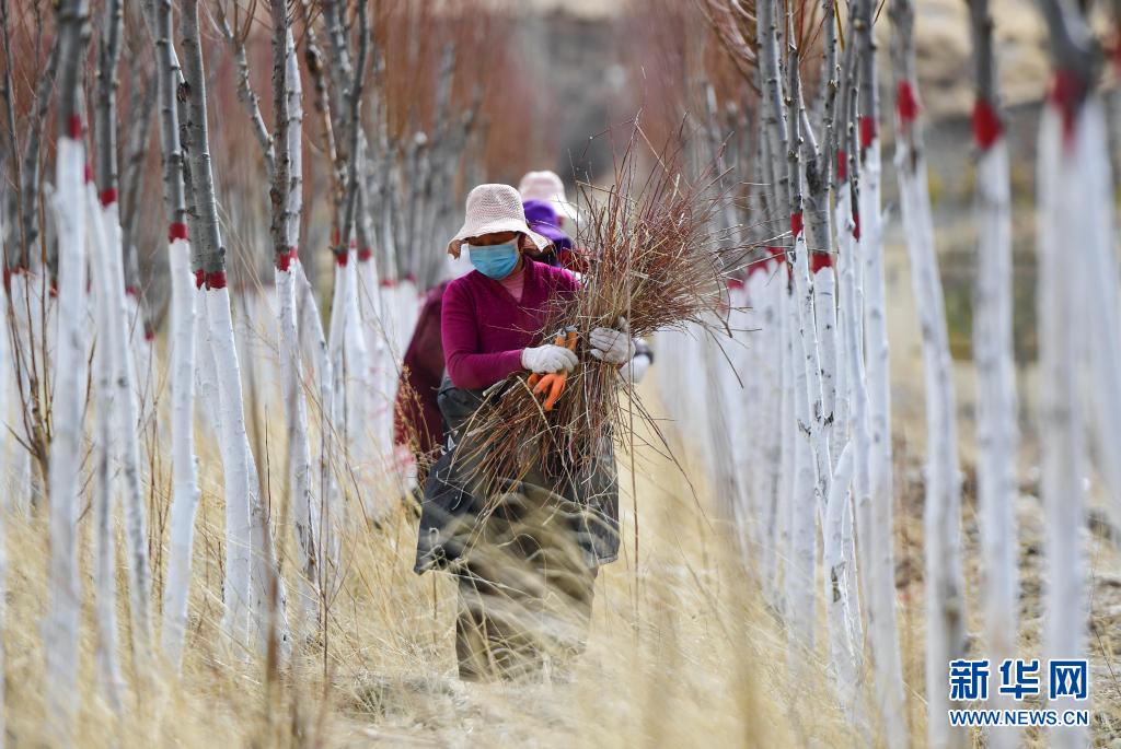 在青海省玉樹(shù)藏族自治州高原千畝林木良種繁育實(shí)驗(yàn)基地,當(dāng)?shù)厝罕娫谇謇硇藜暨^(guò)的樹(shù)枝(2020年3月29日攝)。新華社記者 張龍 攝