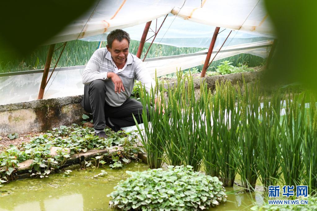 8月5日,魏金明在玉樹市結(jié)古鎮(zhèn)新寨村的蔬菜基地查看水稻長勢。新華社記者 吳剛 攝