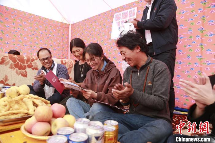圖為果洛州民族高級中學(xué)校長李鵬(左一)與麻切仁措一家分享收到錄取通知書的喜悅。馬銘言攝