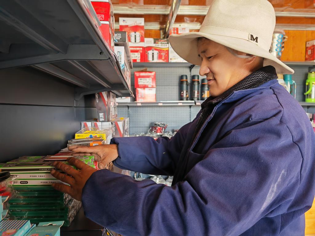7月27日,“綠色超市”管理員達桑正在整理貨架。新華社記者 周盛盛 攝