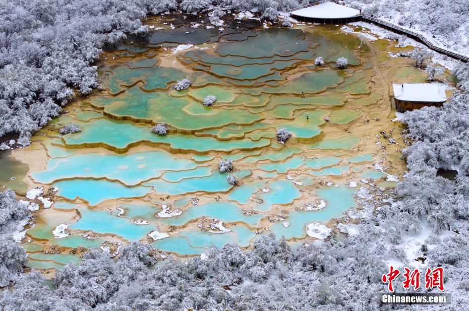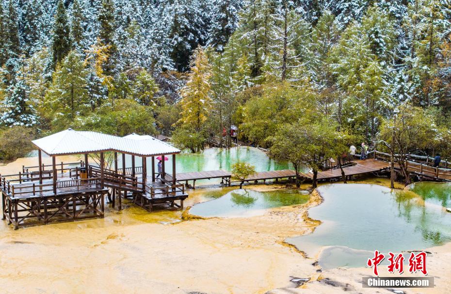 10月12日,被譽(yù)為“人間瑤池”的四川松潘黃龍景區(qū)迎來降雪。白雪覆蓋了彩池旁的原始森林、棧道、古寺,白雪與池水相映,宛如童話世界。