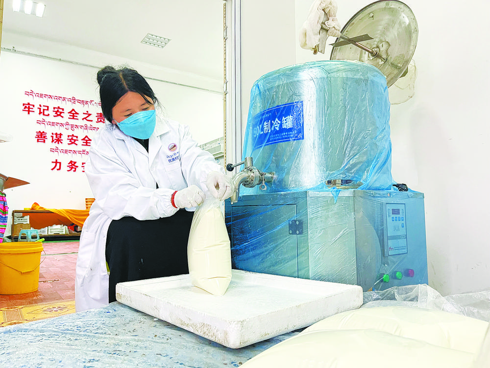 牦牛養(yǎng)得壯,乳制品、肉制品等延伸產(chǎn)品同樣生產(chǎn)加工忙。廠房?jī)?nèi),工人白忠正在灌裝新鮮的牦牛奶,這些鮮奶可以在銷售點(diǎn)現(xiàn)賣,還能冷凍儲(chǔ)存待銷售?!瓣笈D虪I(yíng)養(yǎng)價(jià)值高,做成酸奶、奶干更能讓大眾接受。牦牛奶和乳制品是合作社的搶手產(chǎn)品,銷售得好,我們的收入也提高了,現(xiàn)在生活過(guò)得有滋有味?!?/p>