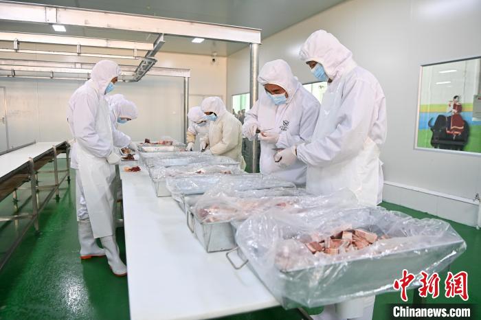 10月31日,走進(jìn)碌曲縣洮源牧場(chǎng)農(nóng)牧發(fā)展有限責(zé)任公司,一派繁忙景象。圖為工人在對(duì)牦牛肉進(jìn)行精細(xì)分割。九美旦增 攝