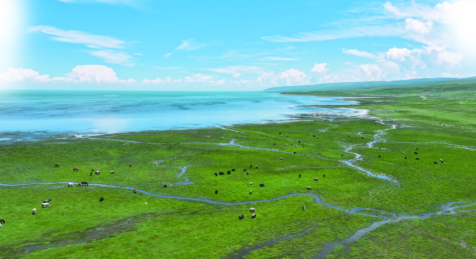 盛夏時(shí)節(jié),漫步在青海湖畔,藍(lán)天、雪山、草原、湖泊勾勒出一幅和美的生態(tài)畫卷。