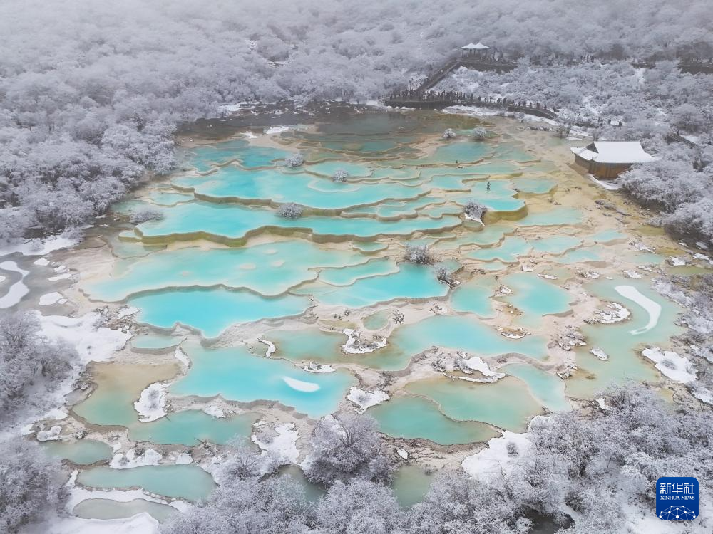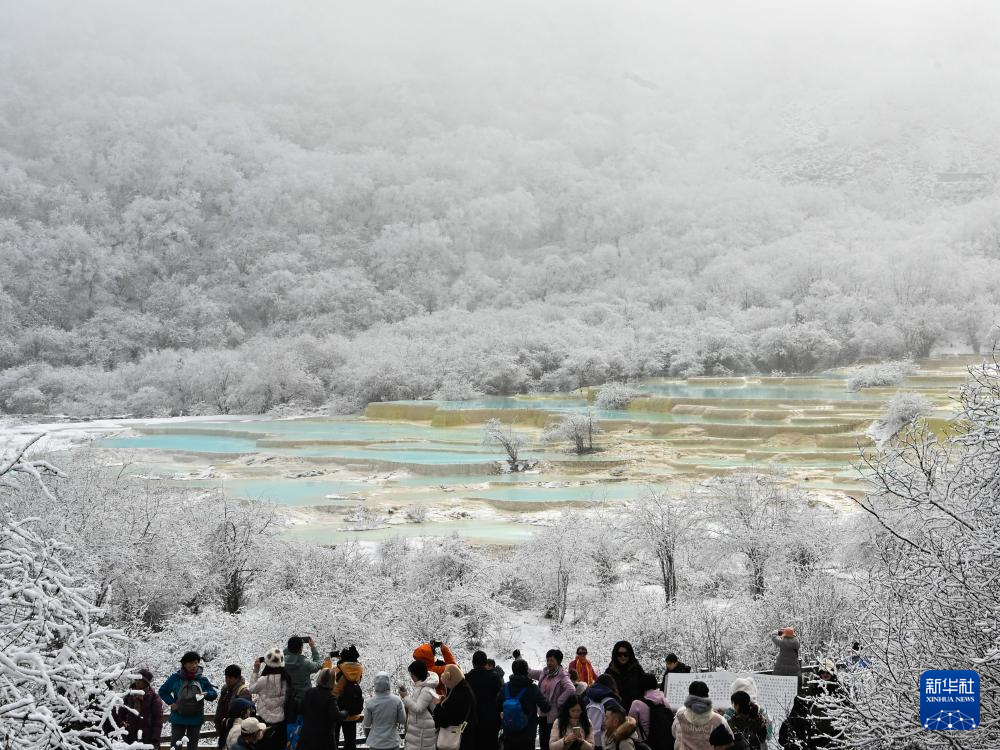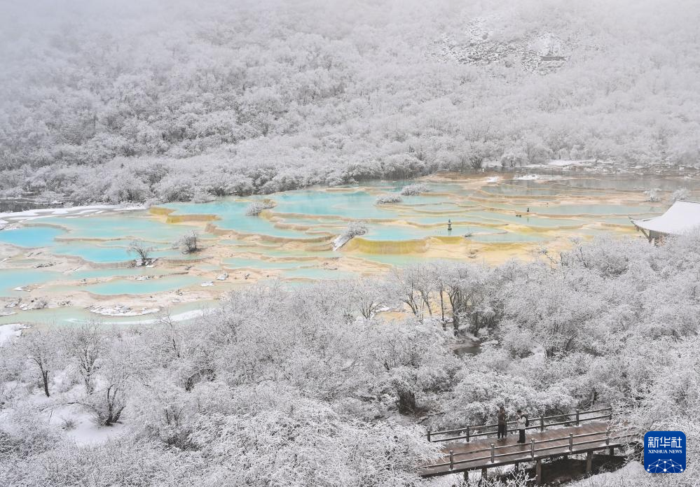 11月18日,雪后的四川省阿壩藏族羌族自治州黃龍景區(qū)薄霧彌漫,仿佛披上了一層輕紗,如夢如幻。