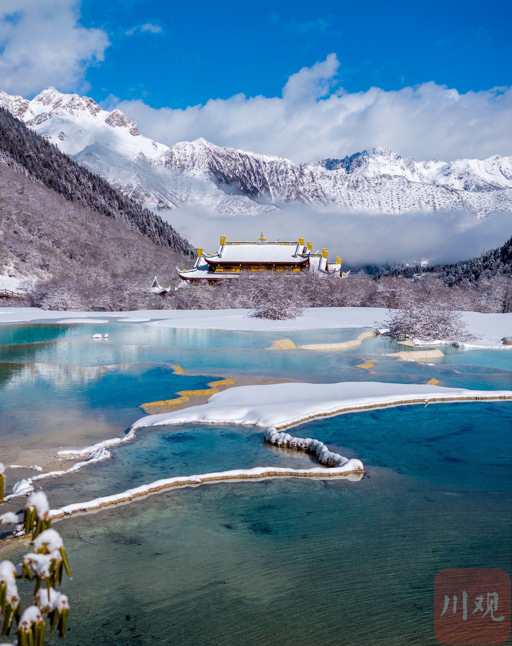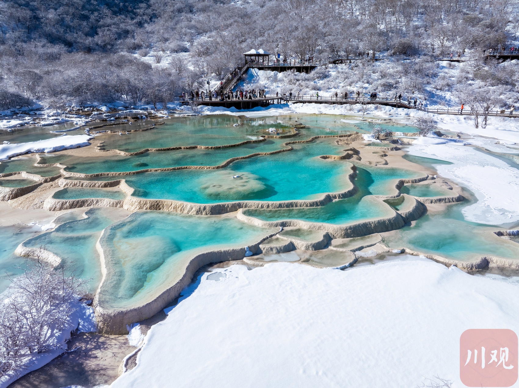 2月20日,大雪覆蓋了黃龍景區(qū)全部范圍,彩池在白雪映襯下更顯青綠,還有四周棧道、原始森林、鈣華、瀑布、古寺,積雪后呈現(xiàn)另一番動人景象。晶瑩剔透的冰花,與四周涌動的春天氣息形成特別的畫卷,藍(lán)綠、明黃、淺白等顏色相互交織,仿佛是大自然的調(diào)色盤。