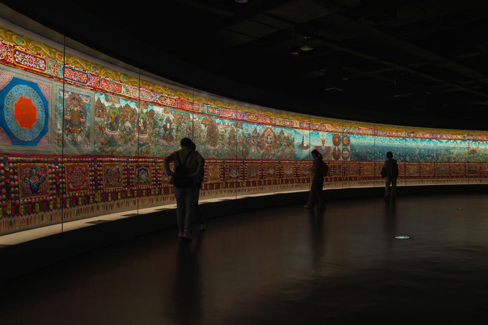 沿著展廳緩緩前行,最令人震撼的莫過于《中國藏族文化藝術彩繪大觀》。講解員溫得兄停在一幅描繪神話傳說的畫面前介紹:“這幅作品由青、藏、甘、川、滇五省區(qū)400位唐卡畫師共同完成,僅上卷創(chuàng)作就歷時27年?!苯衲?月,全長410米的彩繪大觀下卷布展完成,目前正在博物館北館特展展出。