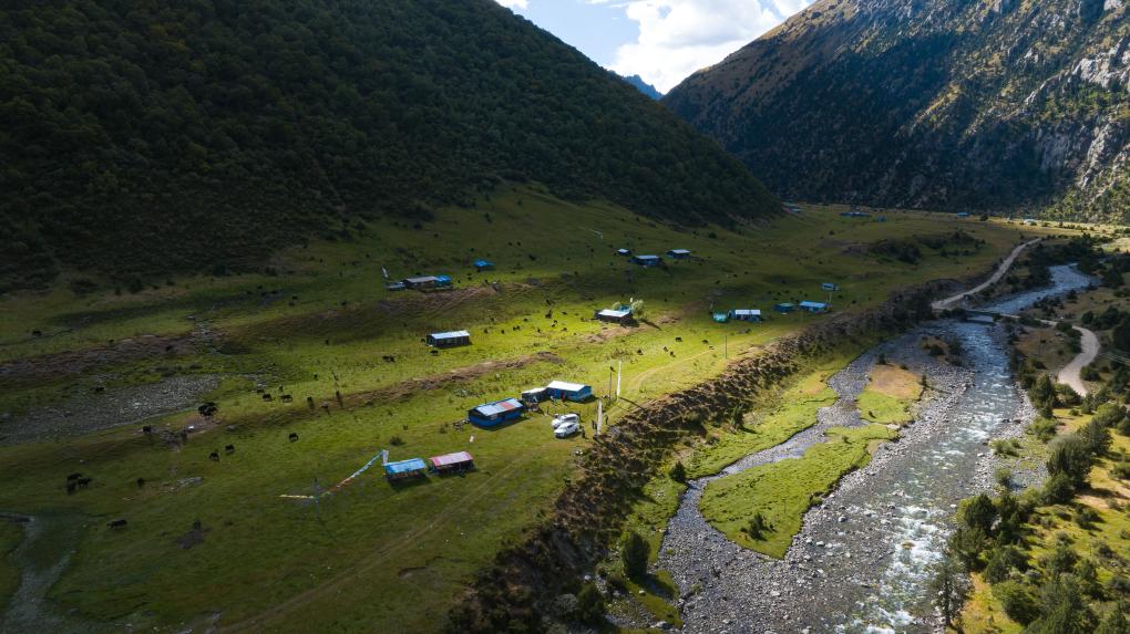 貢喬熱旦家夏季牧場(chǎng)的全貌(無(wú)人機(jī)照片,9月4日攝)。新華社記者 丁增尼達(dá) 攝