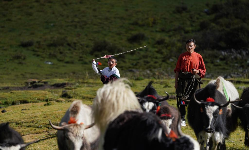貢喬熱旦(左)和父親王登在自家的夏季牧場(chǎng)放牧(9月4日攝)。新華社記者 晉美多吉 攝