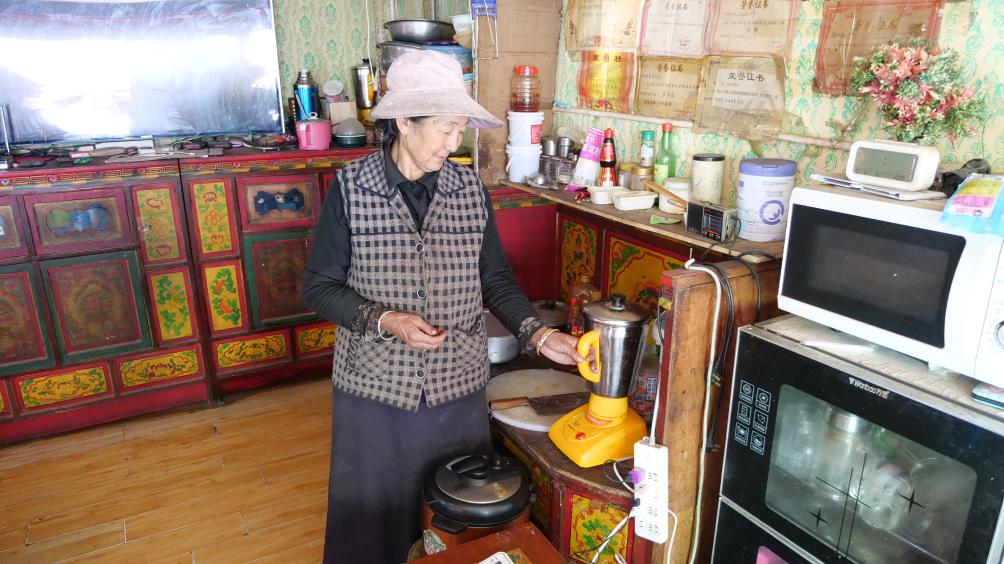 10月21日,瓊國在家使用電動(dòng)酥油機(jī)。新華社記者魏冠宇 攝