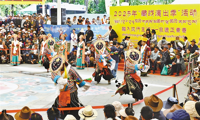 6月13日,以“融入現(xiàn)代生活——非遺正青春”為主題的2025年“藏戲演出季”活動在拉薩市宗角祿康公園舉行。本次活動由非遺體驗(yàn)、產(chǎn)品展銷、藏戲展演三個部分組成,精彩的表演吸引了眾多市民游客觀看。圖為活動現(xiàn)場,拉薩市堆龍德慶區(qū)措麥藏戲隊帶來的藏戲劇目《智美更登》。記者 旦增蘭澤 攝