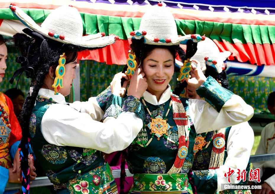 6月28日,拉薩首屆林卡囊瑪堆諧大賽在達孜區(qū)舉辦。現(xiàn)場,經(jīng)過前期海選入圍的19支隊伍依次上臺競技。囊瑪和堆諧,合稱囊瑪堆諧,是西藏民間歌舞發(fā)展到較高層次、集歌舞樂為一體的珍貴傳統(tǒng)文化藝術(shù)遺產(chǎn),深受當?shù)孛癖姷南矏叟c追捧。圖為首屆林卡囊瑪堆諧大賽比賽現(xiàn)場,參賽隊伍正在整理妝容。