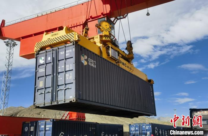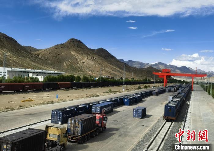 圖為6月29日,西藏日喀則西站內(nèi),貨車有序通行,集裝箱整齊排列,龍門吊起落不停。范樹(shù)兵攝