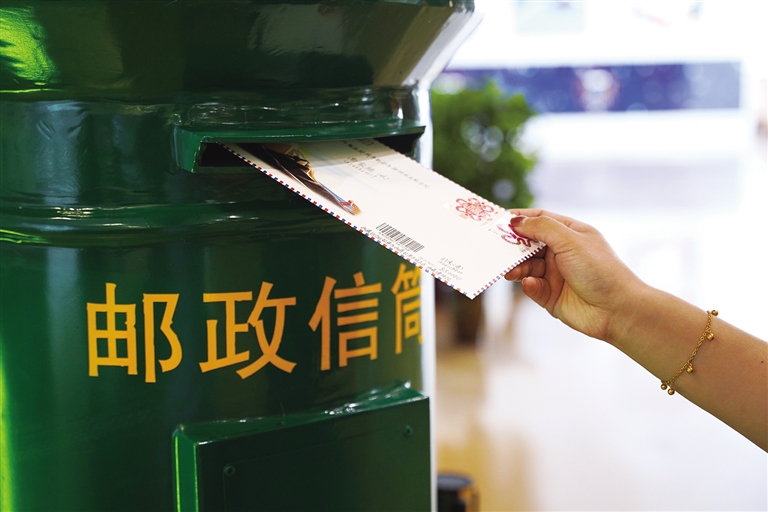 游客正在郵政服務(wù)點(diǎn)選購、寄出明信片。