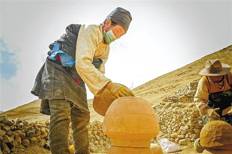 彭崗陶器制作工序繁復(fù),需歷經(jīng)取土、運(yùn)輸、粉碎、塑型、曬干、上水、燒制、成型、上漆(釉)等9道流程。僅取土環(huán)節(jié)便大有門道。年幼的桑珠緊隨舅舅,攀上海拔4475米的扎拉山山頂,在那處獨(dú)特土源地采擷優(yōu)質(zhì)黏土。