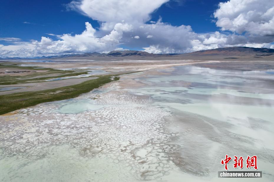 7月20日,航拍西藏阿里地區(qū)革吉縣鹽湖鄉(xiāng)境內的鹽湖。一千多年前,阿里地區(qū)有50多家駐扎的鹽幫,將自然鹽用羊馱牛背邊放牧邊運輸?shù)姆绞?,運送到普蘭、日喀則、印度、尼泊爾等地,并用以物易物的方式換回青稞、磚茶、布料等日常生活所需的物品,從而孕育了遠負盛名的“鹽羊古道”傳奇。近年來,當?shù)亻_辦粗鹽巴加工廠、打造“鹽羊古道”旅游品牌等方式,使千年“鹽羊古道”煥發(fā)新生機。(無人機照片)中新社記者 張祥毅 攝