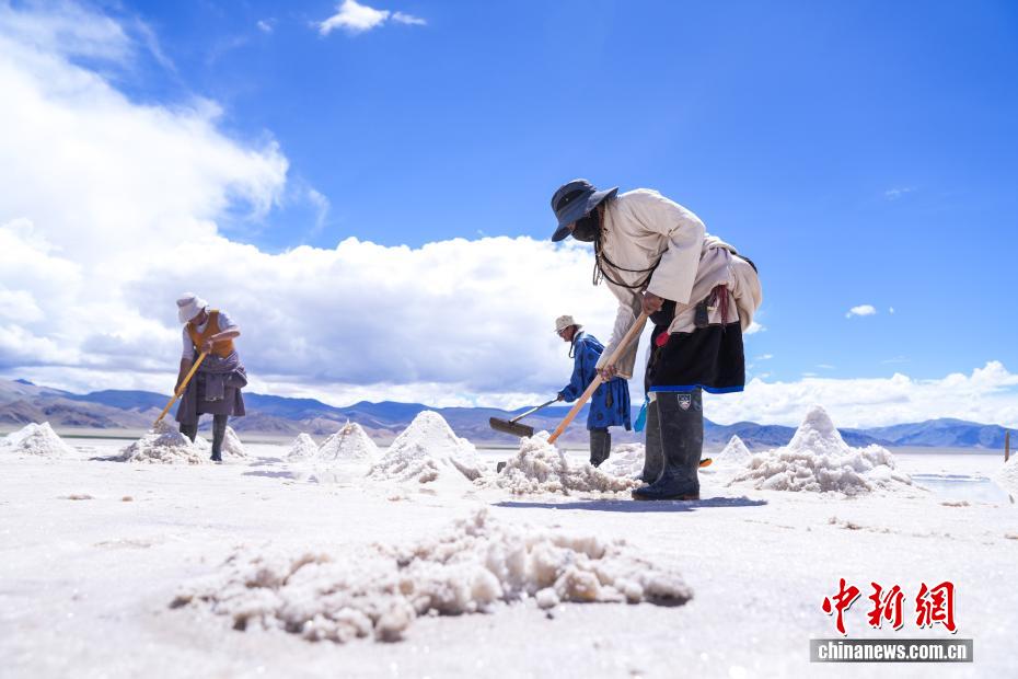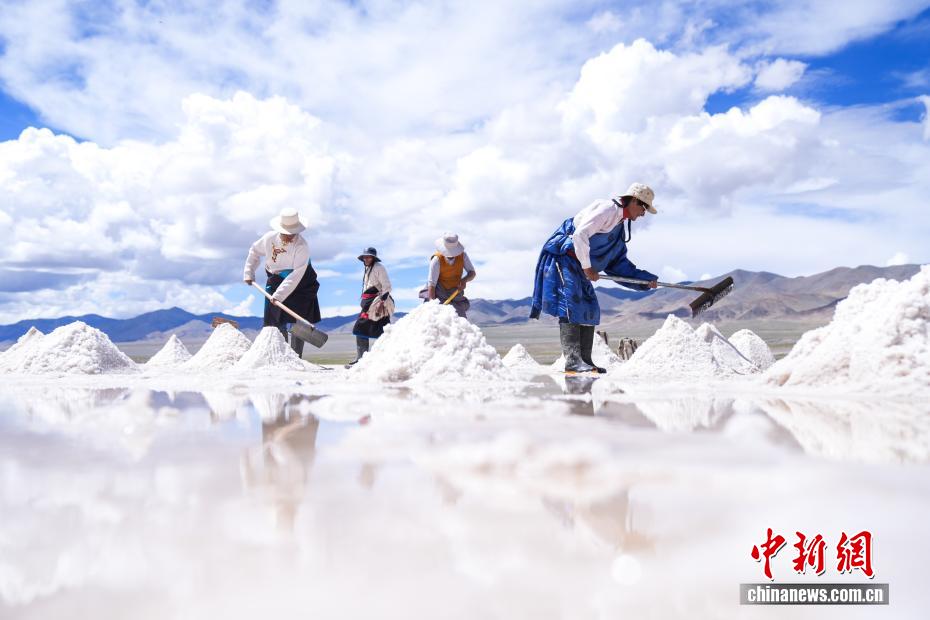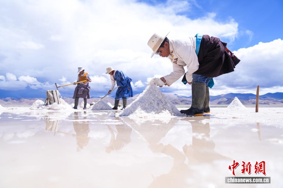 7月20日,在西藏阿里地區(qū)革吉縣鹽湖鄉(xiāng),民眾在鹽湖中采制粗鹽巴。一千多年前,阿里地區(qū)有50多家駐扎的鹽幫,將自然鹽用羊馱牛背邊放牧邊運輸?shù)姆绞剑\送到普蘭、日喀則、印度、尼泊爾等地,并用以物易物的方式換回青稞、磚茶、布料等日常生活所需的物品,從而孕育了遠負盛名的“鹽羊古道”傳奇。近年來,當?shù)亻_辦粗鹽巴加工廠、打造“鹽羊古道”旅游品牌等方式,使千年“鹽羊古道”煥發(fā)新生機。中新社記者 張祥毅 攝