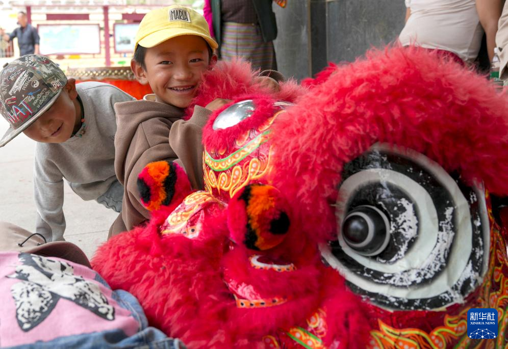 小朋友觀看碩督獅子舞的演出道具(7月21日攝)。新華社記者 晉美多吉 攝