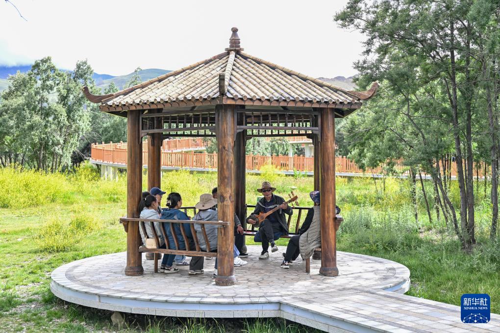 隆子縣居民在沙棘林生態(tài)公園彈奏樂器。新華社記者 李鑫 攝