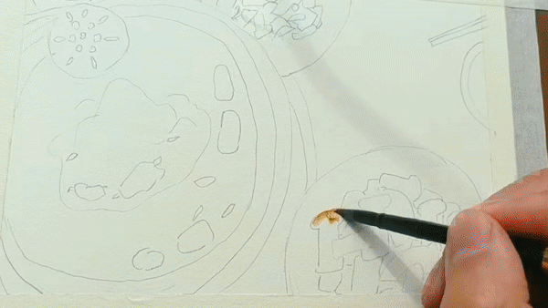展開畫紙,最先捕捉到的是夏日魯朗層次豐富的綠意:嫩綠的草地鋪展開來,湖水映出清澈的藍(lán)綠色澤,遠(yuǎn)處的山巒泛著淡淡青色,層層疊疊。道路在明媚的陽光下,潔白如雪,在綠色中蜿蜒,串聯(lián)起一個(gè)個(gè)藏式村落。