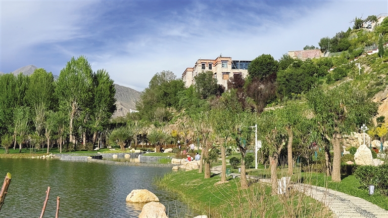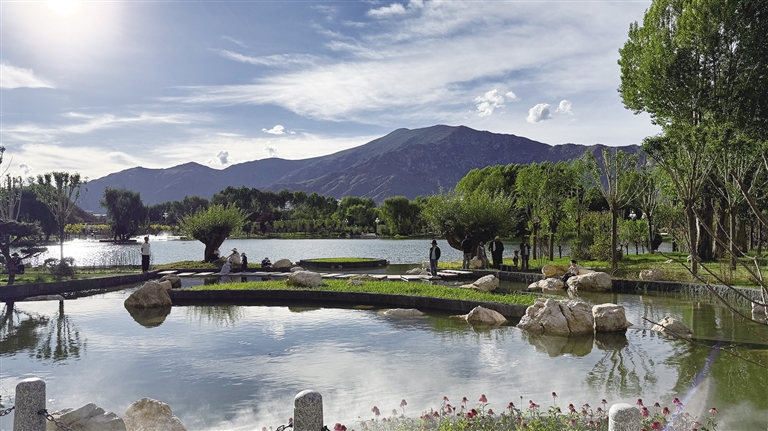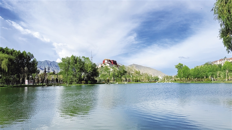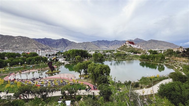 拉薩團結公園坐落于布達拉宮西麓、藥王山腳下。昔日,這里房屋高低錯雜、線纜交錯密布、市場喧鬧擁擠、環(huán)境喧囂擾攘,不僅影響城市形象和生態(tài)環(huán)境,還影響出行游玩體驗。如今,湖水如碧綢般清澈,岸邊綠樹成蔭,各類花卉競相綻放,昔日雜亂之地已蛻變?yōu)轸浯涿髦?,人文古跡與自然景致相映成趣,共同繪就出“百澤繞城·水城相依”的生態(tài)文明畫卷。