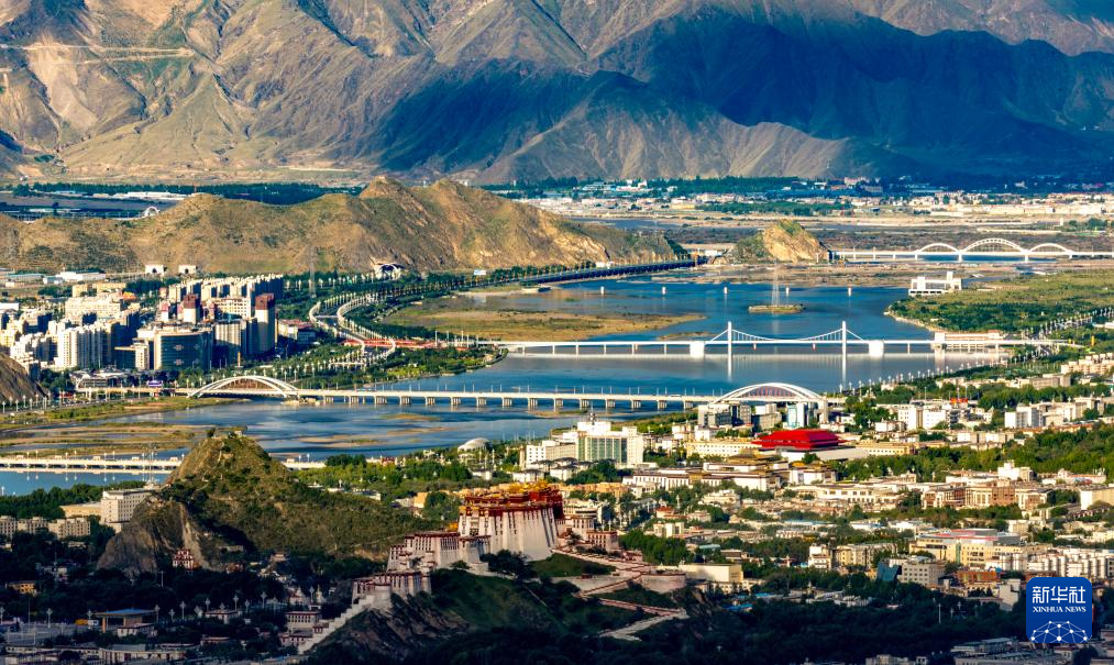 這是7月30日拍攝的拉薩河風光,由近及遠分別是連心橋、柳梧大橋、和美橋和青藏鐵路拉薩河特大橋。新華社記者 姜帆 攝