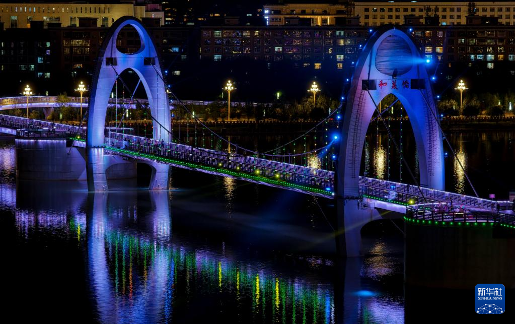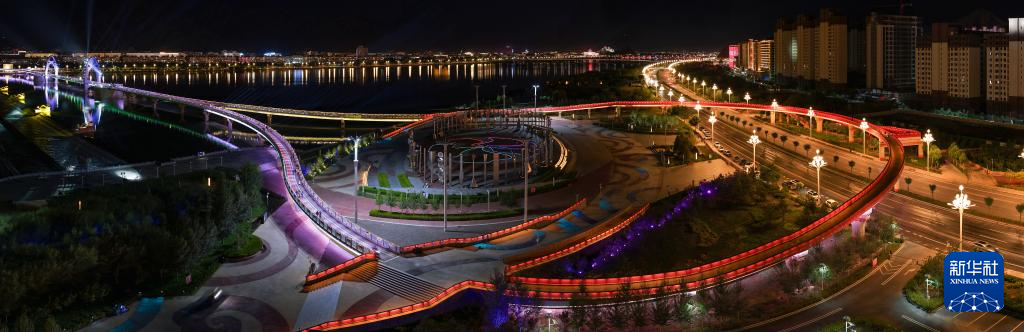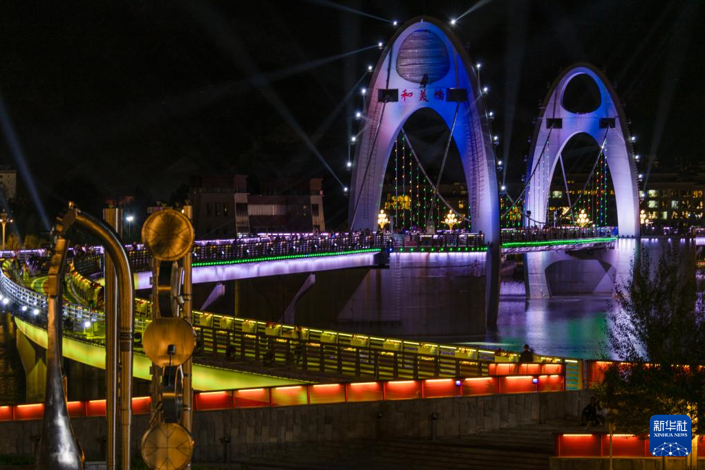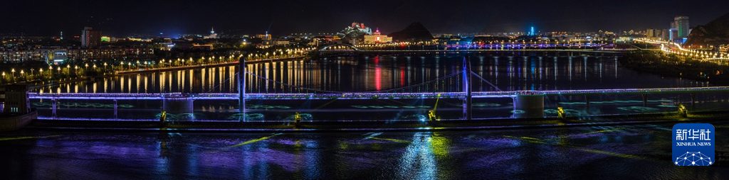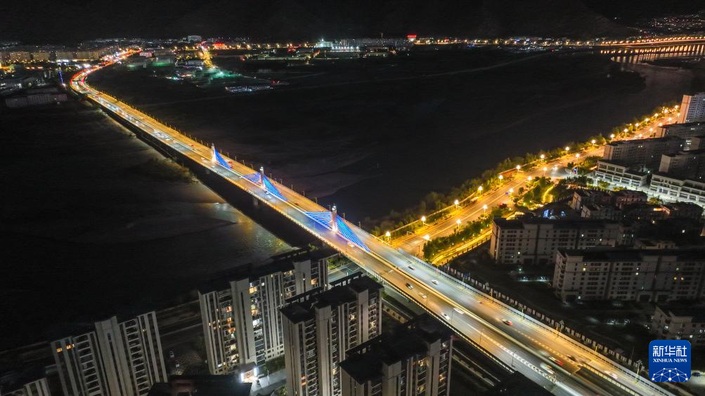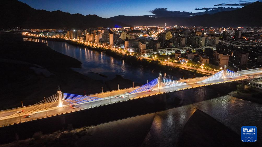 這是7月30日拍攝的拉薩河夜景,由近及遠分別是和美橋、柳梧大橋和連心橋(無人機拼接照片)。新華社記者 姜帆 攝