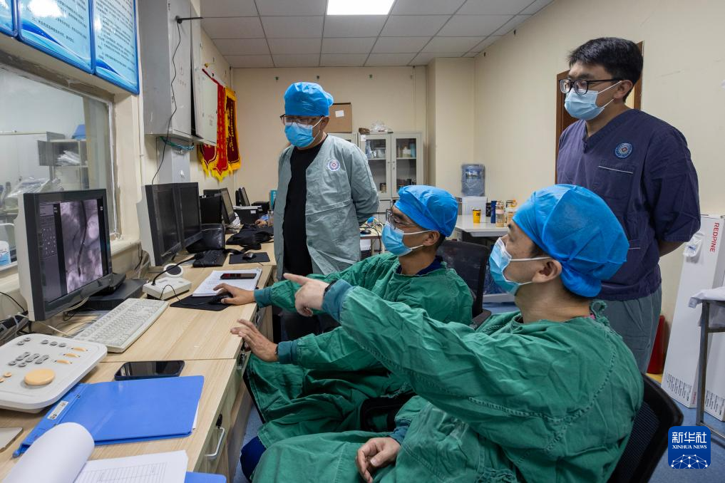 協(xié)和醫(yī)院第十批援藏醫(yī)生王強(左四)、第十一批援藏醫(yī)生蔣青偉(左三)和西藏自治區(qū)人民醫(yī)院醫(yī)生扎西(左一)在拉薩為患者施行內(nèi)鏡逆行胰膽管造影術(8月5日攝)。新華社記者 姜帆 攝