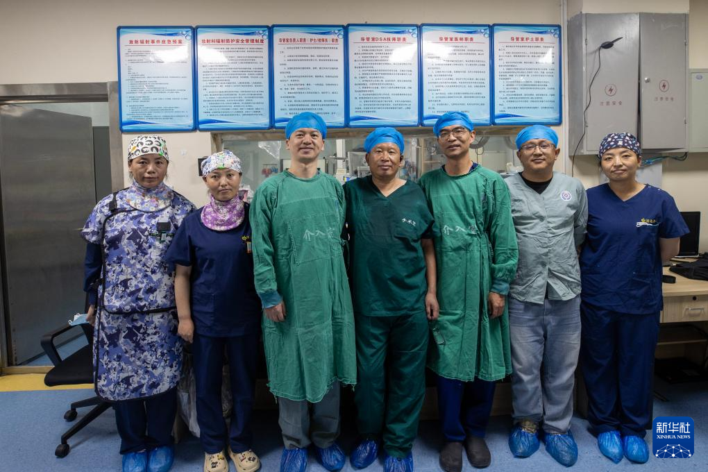 協(xié)和醫(yī)院第十批援藏醫(yī)生王強(右三)、第十一批援藏醫(yī)生蔣青偉(左三)和西藏自治區(qū)人民醫(yī)院醫(yī)生扎西(中)、旦增索朗(右二)及手術團隊,在拉薩為患者施行內(nèi)鏡逆行胰膽管造影術后合影(8月5日攝)。新華社記者 姜帆 攝