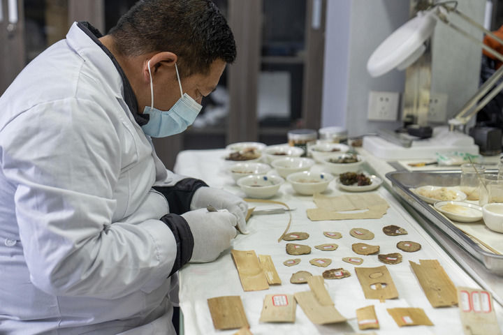 布達(dá)拉宮貝葉經(jīng)實(shí)驗(yàn)性修復(fù)小組實(shí)驗(yàn)室工作人員對貝葉進(jìn)行處理(2025年5月25日攝)。新華社記者 旦增尼瑪曲珠 攝