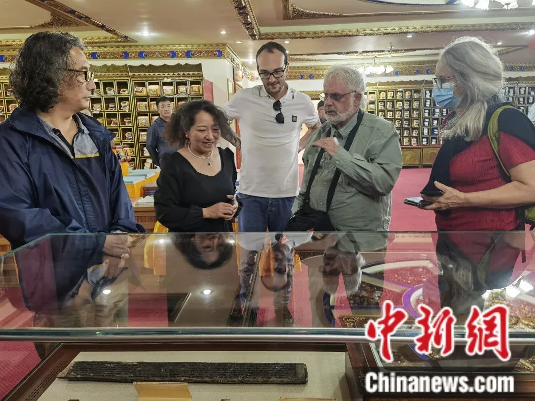 圖為2023年9月20日,外籍專家學(xué)者參觀西藏大學(xué)圖書(shū)館藏文古籍研究所。中新社記者 趙延 攝