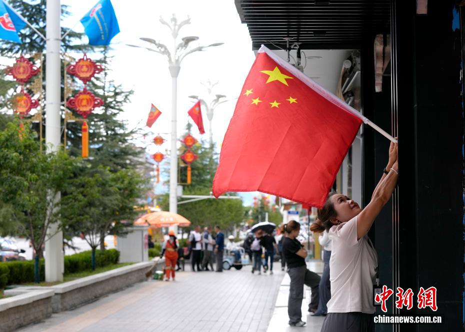 8月19日,隨著西藏自治區(qū)成立60周年慶祝活動臨近,拉薩氛圍濃。拉薩街頭,處處是張燈結(jié)彩的盛景,洋溢著一派祥和與歡騰的氛圍。圖為拉薩北京中路商鋪懸掛國旗。中新社記者 李林 攝