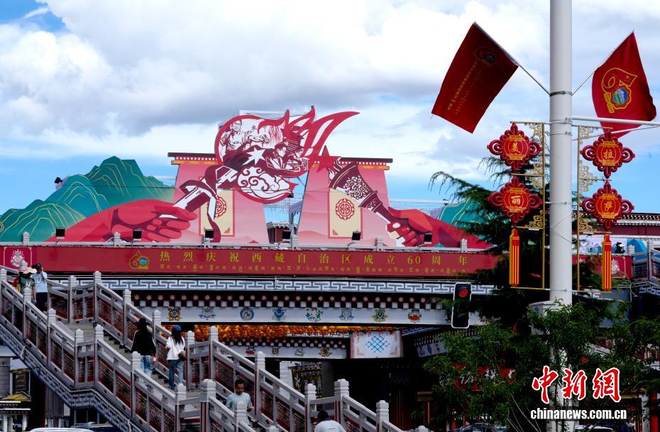 8月19日,隨著西藏自治區(qū)成立60周年慶?;顒优R近,拉薩氛圍濃。拉薩街頭,處處是張燈結(jié)彩的盛景,洋溢著一派祥和與歡騰的氛圍。圖為拉薩裝扮一新的人行天橋。中新社記者 李林 攝