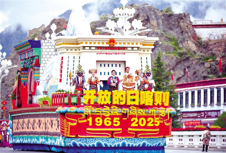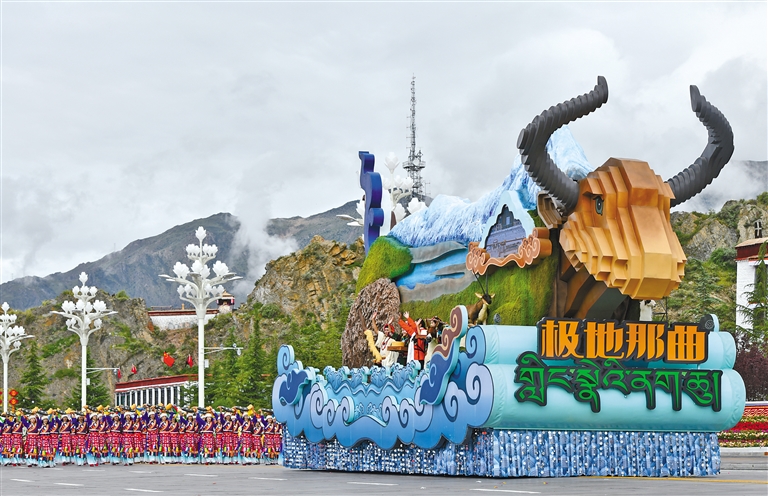 居于方陣中間的七市(地)彩車,各具神韻:拉薩彩車,布達(dá)拉宮“之”字形階梯與綠意南北山相映成趣,黑頸鶴展翅,八廓街古今交融,古城活力撲面而來;日喀則彩車以吉隆口岸為車頭,國門前,兩名著定日服飾的地震災(zāi)區(qū)群眾代表,手捧切瑪,表達(dá)對黨中央的深深感恩之情;山南彩車化牛皮筏為“前進(jìn)中的方舟”,雅江奔流,激蕩千年歷史與今朝活力;林芝彩車讓雅江托起嘎拉村大門,村黨支部書記捧讀總書記回信,感恩與愛戴隨江風(fēng)遠(yuǎn)揚(yáng);昌都彩車以紅旗勾勒車體,“西藏第一面五星紅旗升起的地方”紅色印記熠熠生輝;那曲彩車破浪疾行,天下第一道班、青藏鐵路、公路縮影依次呈現(xiàn),盡顯“極地那曲”改革創(chuàng)新的萬丈豪情;阿里彩車如一葉方舟,岡仁波齊與札達(dá)土林巍然矗立,獅泉河浪花托起“亞洲水塔”的生態(tài)使命。