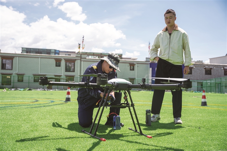 “低一點(diǎn)、再低一點(diǎn)。好,轉(zhuǎn)圈?!?月20日,記者來(lái)到西藏藏泱闊低空科技有限責(zé)任公司時(shí),邊巴次仁正神情專注地和無(wú)人機(jī)教官一起熟練地操作著無(wú)人機(jī)。教官的雙手在遙控器上操控著,邊巴次仁的目光則緊緊鎖定無(wú)人機(jī)的飛行軌跡,時(shí)不時(shí)提醒幾句。