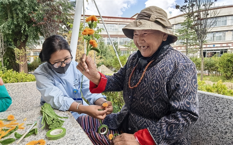 近日,記者走進(jìn)拉薩市社會(huì)福利院的大門,一陣歡快的笑聲便撲面而來。循聲望去,涼亭下,幾位老人正圍坐在一起,手中拿著彩色毛線,在編織老師的耐心指導(dǎo)下專注地編織著花朵?!翱?,我的花做好了!”卓嘎老人高高舉起剛剛完成的一朵黃色小花,孩子般興奮地向同伴們展示。她的手指雖有些顫抖,但眼神中卻掩飾不住自豪。另外一邊,幾位老人正在院子里悠閑地散步,一位護(hù)工正小心翼翼地?cái)v扶著行動(dòng)不便的老人,輕聲問道:“今天腿還疼嗎?要不要去理療室做做按摩?”關(guān)切之情溢于言表。