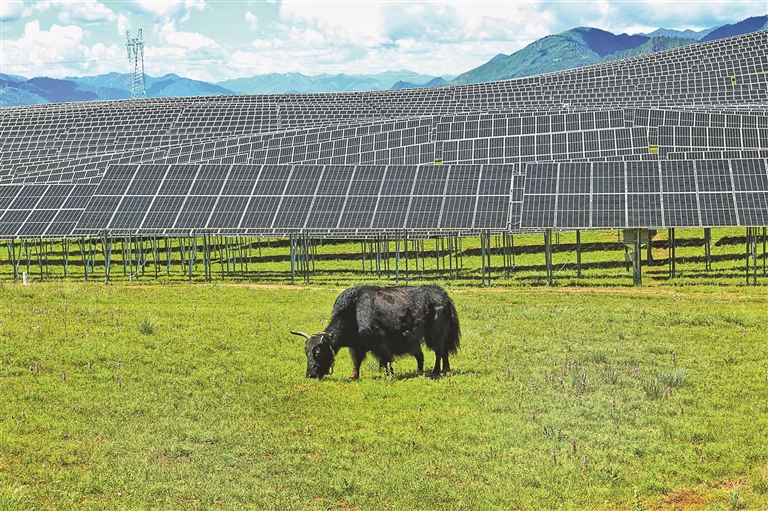 熱瓦鄉(xiāng)熱熱村是典型的牧業(yè)村,位于那曲市索縣的群山峻嶺之間。2023年12月,西藏開投集團投資建設(shè)的50MW牧光互補儲能項目在這里并網(wǎng)發(fā)電,遠遠望去像是山坡上的“藍色湖泊”。牧民們每天會趕著羊群來這里放牧,陽光透過光伏板的縫隙灑在草地上,羊群在陰涼下自由覓食。在光伏板的“庇護”下,不僅山地植被可以免受烈日大風的侵襲,還能對養(yǎng)殖的動物起到保護效果,在充分利用光能優(yōu)勢的同時,為鄉(xiāng)村振興注入新動能,實現(xiàn)企業(yè)和農(nóng)牧民雙向受益。