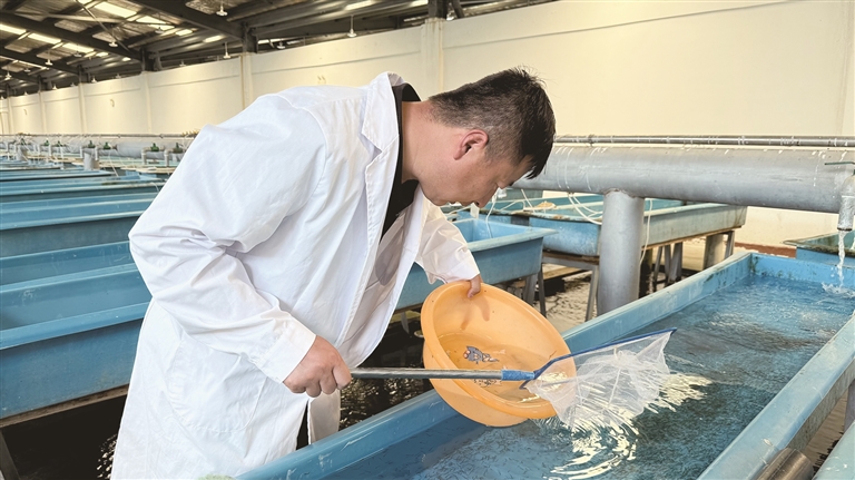 基因組信息更直接指導(dǎo)了全人工繁育體系的優(yōu)化。“我們發(fā)現(xiàn)黑斑原鮡的性腺發(fā)育與光照周期、水溫存在強(qiáng)關(guān)聯(lián)?!蓖跞f良說,團(tuán)隊(duì)還通過轉(zhuǎn)錄組測序揭示了苗種拒食行為的分子機(jī)制——其腸道缺乏消化植物蛋白的基因,這促使科研人員開發(fā)出以小型水生動物為主的專用飼料,成功解決了開口餌料難題。