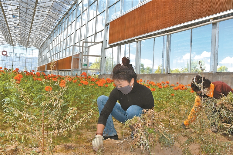圖為在家門口實現(xiàn)就業(yè)的群眾在產(chǎn)業(yè)基地進(jìn)行田間管理。記者 丹增平措 攝
