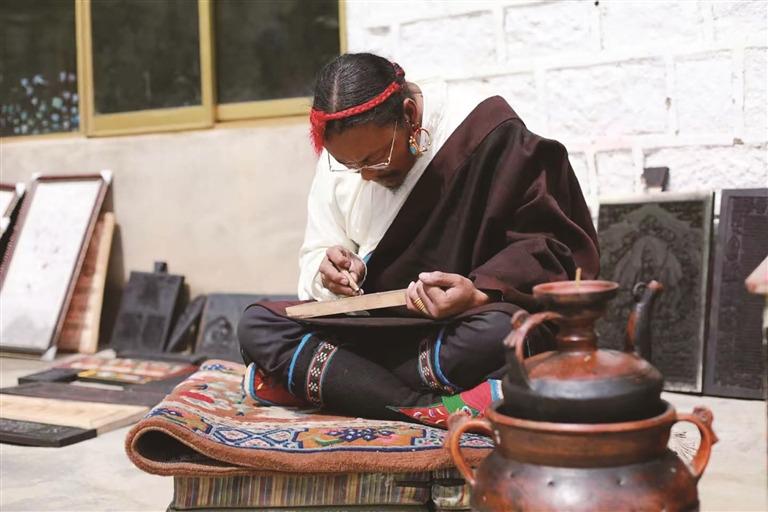 在傳承技藝的過程中,斯曲也面臨著不少挑戰(zhàn)。教徒弟時(shí)最大的困難就是讓他們靜下心來,因?yàn)檫@門手藝需要從小學(xué)起,不僅要學(xué)習(xí)拿工具,還要學(xué)習(xí)認(rèn)字和雕刻。“以前光是學(xué)習(xí)雕刻文字,起碼要9個(gè)月時(shí)間,現(xiàn)在的孩子都很聰明,兩年基本就能掌握雕刻技藝?!彼骨牢康卣f。